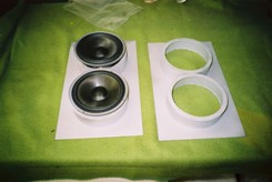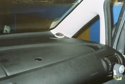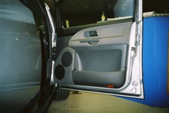 Ford Galaxy Zielsetzung war eine überragende Dynamik. Dafür mussten die Lautsprecheraufnahmen aus 3mm Stahlplatten und massiven Rotgußringen gefertigt werden. Anschließend wurden die Aufnahmen vernietet und verklebt. Zusätzliche Versteifungen in der Tür kamen hinzu. Die mit Leder bezogenen Tür- panele dienen nur noch als reine Lautsprecherab- deckungen. Für die Hochtöner haben wir kleine Gehäuse für das Armaturenbrett gebaut. | |
