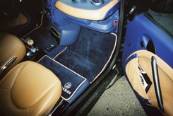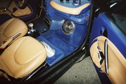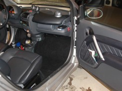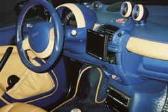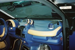 Smart Brabus Viel Equipment im kleinen Wagen! Eine extra Konsole wurde speziel für das Alpine Navi und den Mini Disc Wechsler unter dem Armaturenbrett gebaut. Der mit einem Edelstahhlgitter abgedeckte 8W6 Sub fand seinen Platz samt geschlossenem Gehäuse im Fußraum. Das obere Armaturenbrett wurde komplett umgebaut und mit einen 16er RS Audio Pro System bestückt und neu gesattelt. Eine 5-Kanal Genesis Endstu-fe sitzt vor dem Beifahrersitz und ist durch ein Sicherheitsglas geschützt. Sub und Endstufe sind im Alltagsbetrieb durch spezielle Teppiche Abgedeckt. | |