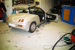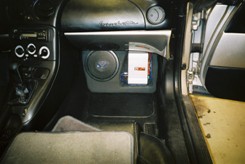 Fiat Barchetta "Ich habe kein Platz für einen Subwoofer!" lautete die Aussage des Kunden. Doch nach eingehender Beratung fanden wir eine sehr kompakte Fußraum- lösung. Cerwin-Vega 20cm Sub im geschlossenen Gehäuse und eine Steg Endstufe fanden Platz im sehr tiefen Fußraum. Eine massive Abdeckung versteckt die komplette Subwooferlösung. Und der Beifahrer hat noch mehr als genug Platz für seine Füße. | ![]() |